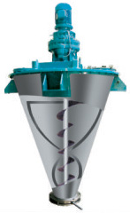 由擺線針輪減速機(jī)連接中心螺桿及外層螺帶以相同轉(zhuǎn)速轉(zhuǎn)動(dòng)。工作時(shí),中心螺桿將混合物料由底部提升到頂部,同時(shí)線速度較大的外部螺帶將物料由下而上沿錐形筒壁盤提升,二種運(yùn)動(dòng)在離心力作用下又將物料沿切線方向拋向空間,物料產(chǎn)生強(qiáng)烈的對(duì)流剪切、擴(kuò)散,從而達(dá)到快速混合的目的。(螺桿也可做成反向螺桿)。