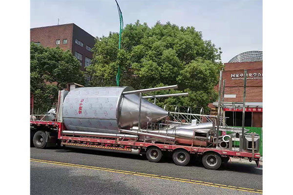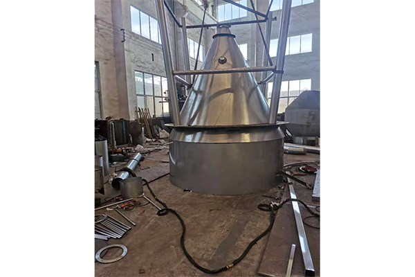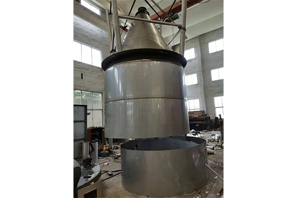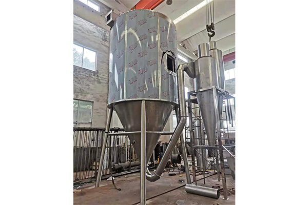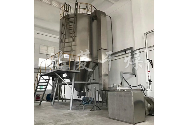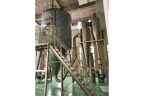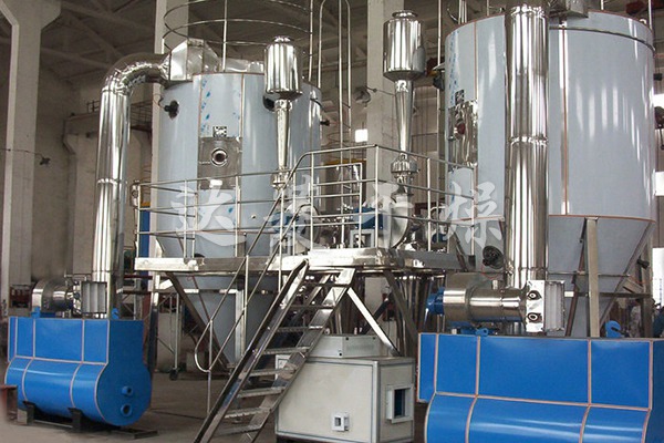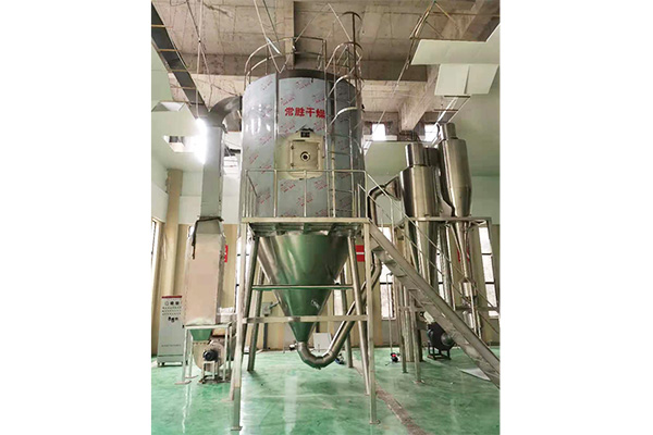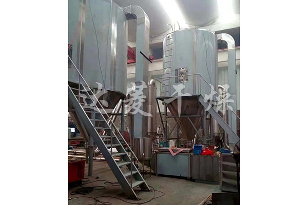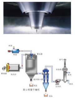 空氣經(jīng)過過濾和加熱,進入干燥器頂部空氣分配器,熱空氣呈螺旋狀均勻地進入干燥室。料液經(jīng)塔體頂部的高速離心霧化器,(旋轉(zhuǎn))噴霧成極細微的霧狀液珠,與熱空氣并流接觸,在極短的時間內(nèi)可干燥為成品。成品連續(xù)地由干燥塔底部和旋風(fēng)分離器中輸出,廢氣由風(fēng)機排空。